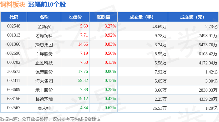 | 代码 | 名称 | 主力净流入(元) | 主力净占比 游资净流入 (元) | | 游资净占比 散户净流入 (元) | | 散户净占比 | | --- | --- | --- | --- | --- | --- | --- | --- | | 002548 | 金新农 | - 4040.13万 | 14.78% | 583.90万 | 2.14% | -4624.03万 | -16.91% | | 001313 粤海饲料 | | 470.27万 | 6.27% | -509.77万 | -6.80% | 39.50万 | 0.53% | | 603609 禾丰股份 | | 194.46万 | 6.85% | -121.09万 | -4.27% | -73.37万 | -2.59% | | 002696 目洋股份 | | 132.04万 | 2.16% | -333.29万 | -5.46% | 201.25万 | 3.29% | | 000702 正虹科技 | | -117.13万 | -2.81% | -240.70万 | -5.77% | 357.84万 | 8.58% | | 001366 播恩集团 ...