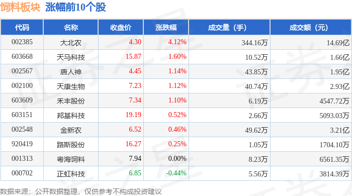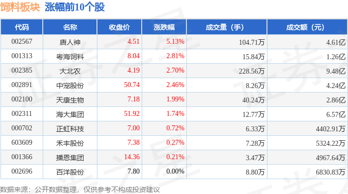 证券之星消息,1月26日饲料板块较上一交易日上涨1.12%,唐人神领涨。当日上证指数报收于4132.61, 下跌0.09%。深证成指报收于14316.64,下跌0.85%。饲料板块个股涨跌见下表: | 代码 | 名称 | 收盘价 | 涨跌幅 | 成交量(手) | 成交额(元) | | --- | --- | --- | --- | --- | --- | | 002567 | 唐人神 | 4.51 | 5.13% | 104.71万 | 4.61亿 | | 001313 | 刻思想 | 8.04 | 2.81% | 15.84万 | 1.26亿 | | 002385 | 大北农 | 4.19 | 2.70% | 228.56万 | 9.48 6 | | 002891 | 中宠股份 | 50.74 | 2.46% | 8.26万 | 4.24亿 | | 002100 | 天康生物 | 7.18 | 1.99% | 40.24万 | 2.86亿 | | 002311 | 海大集团 | 51.92 | 1.74% | 12.77万 | 6.57亿 | | 000702 | 正虹科技 | 7.00 | 0.72% | ...