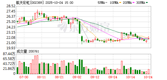 10月23日,航天彩虹盘中下跌2.01%,截至10:10,报20.97元/股,成交1.09亿元,换手率0.52%,总市值 206.54亿元。 资金流向方面,主力资金净流出1675.07万元,特大单买入202.49万元,占比1.86%,卖出712.13万元, 占比6.53%;大单买入1378.45万元,占比12.65%,卖出2543.88万元,占比23.34%。 航天彩虹今年以来股价涨16.56%,近5个交易日跌6.13%,近20日跌1.83%,近60日跌15.27%。 今年以来航天彩虹已经1次登上龙虎榜,最近一次登上龙虎榜为9月3日,当日龙虎榜净买入-4094.72万 元;买入总计1.08亿元 ,占总成交额比7.20%;卖出总计1.49亿元 ,占总成交额比9.93%。 资料显示,航天彩虹无人机股份有限公司位于北京市丰台区云岗西路17号,浙江省台州市台州湾集聚区 海豪路788号,成立日期2001年11月30日,上市日期2010年4月13日,公司主营业务涉及从事无人机整机 产品和应用服务;电容器薄膜和太阳能电池背材膜、光学膜、锂离子电池隔膜等的制造和销售。主营业 务收入构成为:无人机及相关产品37.59%,背材膜 ...