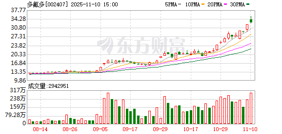Group 1 - The core viewpoint of the news is the performance and market position of Duofuduo New Materials Co., Ltd., which has seen a stock price increase of 5.01% to 34.59 CNY per share, with a total market capitalization of 41.177 billion CNY [1] - Duofuduo's main business segments include lithium hexafluorophosphate and electronic chemicals, lithium-ion batteries, new energy vehicles, and inorganic fluorides, with revenue contributions of 34.97% from new energy materials, 30.39% from fluorine-based new materials, 25.30% from new energy batteries, 5.55% from electronic information materials, and 3.80% from other sources [1] Group 2 - Among the top ten circulating shareholders of Duofuduo, the Guangfa Fund's ETF for new energy vehicle batteries has entered the list, holding 11.0172 million shares, which is 1.02% of the circulating shares, resulting in an estimated profit of approximately 18.1783 million CNY [2] - The Guangfa National Index New Energy Vehicle Battery ETF was established on June 15, 2021, with a current scale of 15.097 billion CNY, achieving a year-to-date return of 68.75% and a one-year return of 55.31% [2]