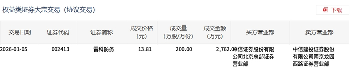 | 权益类证券大宗交易(协议交易) | | --- | | 交易日期 | 证券代码 | 证券简称 | 成交价格 | 成交量 | 成交金额 买方营业部 | | 卖方营业部 | | --- | --- | --- | --- | --- | --- | --- | --- | | | | | (元) | (万股/万份) | (万元) | | | | 2026-01-05 | 002413 | 雷科防务 | 13.81 | 200.00 | 2,762.00信证券股份有限 | | 中信建投证券股份 | | | | | | | | 公司北京总部证券 | 有限公司南京龙园 | | | | | | | | 营业部 | 西路证券营业部 | 1月5日,雷科防务大宗交易成交200万股,成交额2762万元,占当日总成交额的6.67%,成交价13.81 元,较市场收盘价13.81元持平。 ...