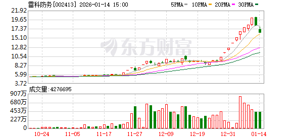 | 证券代码:002413 | 证券简称:雷科防务 | 公告编号:2026-004 | | --- | --- | --- | | 债券代码:124012 | 债券简称:雷科定02 | | 2、公司未发现近期公共媒体报道了可能或已经对公司股票交易价格产生较 大影响的未公开重大信息; 3、近期公司生产经营情况正常,内外部经营环境未发生重大变化; 北京雷科防务科技股份有限公司 股票交易异常波动公告 本公司及董事会全体成员保证本公告内容的真实、准确和完整,没有虚假 记载、误导性陈述或重大遗漏。 一、股票交易异常波动情况 北京雷科防务科技股份有限公司(证券名称:雷科防务,证券代码:002413, 以下简称"公司")股票连续 3 个交易日内(2026 年 1 月 13 日、2026 年 1 月 14 日、2026 年 1 月 15 日)收盘价格跌幅偏离值累计达到-20%以上,根据《深圳证 券交易所交易规则》的相关规定,属于股票交易异常波动的情况。 二、公司关注及核实情况说明 针对公司股票交易异常波动的情况,公司对相关事项进行了核实,现就有关 情况说明如下: 1、截至本公告日,公司前期披露的信息不存在需要更正、补充之处; ...
