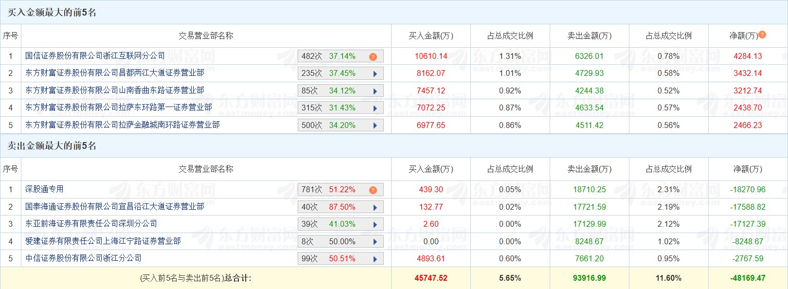 龙虎榜丨雷科防务跌停,深股通净卖出1.83亿元,二游资净卖出3.47亿元