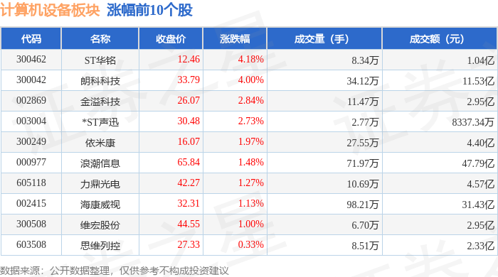 从资金流向上来看,当日计算机设备板块主力资金净流出4.99亿元,游资资金净流出1.59亿元,散户资金 净流入6.58亿元。计算机设备板块个股资金流向见下表: 证券之星消息,1月22日计算机设备板块较上一交易日上涨0.04%,力鼎光电领涨。当日上证指数报收于 4122.58,上涨0.14%。深证成指报收于14327.05,上涨0.5%。计算机设备板块个股涨跌见下表: | 代码 | 名称 | 收盘价 | 涨跌幅 | 成交量(手) | 成交额(元) | | --- | --- | --- | --- | --- | --- | | 605118 | 力鼎光电 | 41.83 | 9.99% | 4.60万 | 1.86亿 | | 000066 | 中国长城 | 19.50 | 9.43% | 719.23万 | 137.44亿 | | 301042 | 安联锐视 | 84.94 | 5.07% | 3.24万 | 2.73亿 | | 300042 | 朗科科技 | 32.86 | 4.78% | 44.19万 | 14.88亿 | | 002512 | 达华智能 | 6.59 | 4.60% | 107.49万 | ...