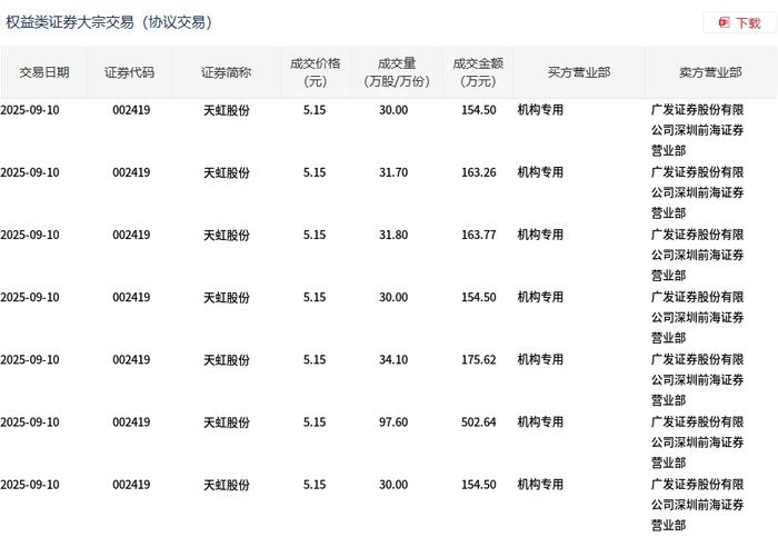 | 交易日期 | 证券代码 | 证券简称 | 成交价格 | 成交量 | 成交金额 | 买方营业部 | 卖方营业部 | | --- | --- | --- | --- | --- | --- | --- | --- | | | | | (元) | (万股/万份) | (万元) | | | | 2025-09-10 | 002419 | 天虹股份 | 5.15 | 30.00 | 154.50 机构专用 | | 广发证券股份有限 | | | | | | | | | 公司深圳前海证券 | | | | | | | | | 营业部 | | 2025-09-10 | 002419 | 天虹股份 | 5.15 | 31.70 | 机构专用 163.26 | | 广发证券股份有限 | | | | | | | | | 公司深圳前海证券 | | | | | | | | | 营业部 | | 2025-09-10 | 002419 | 天虹股份 | 5.15 | 31.80 | 163.77 机构专用 | | 广发证券股份有限 | | | | | | | | | 公司深圳前海证券 | | | | | | | | | 营业部 | | ...