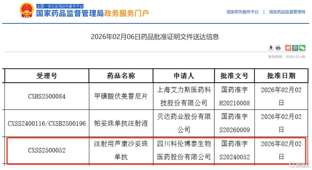 2月6日,据国家药品监督管理局(NMPA)官网公示,TROP2 ADC药物——芦康沙妥珠单抗(sac-TMT)正式获批一项新适应症,用于治疗既往接受过内分 泌治疗且在晚期或转移性阶段接受过其他系统治疗的不可切除的局部晚期或转移性激素受体阳性(HR+)且人表皮生长因子受体2阴性(HER2-)乳腺癌 (BC)成人患者。值得关注的是,该适应症此前已被国家药监局药品审评中心(CDE)纳入优先审评审批程序,足见其临床价值与市场紧迫性。 | 受理号 | 药品名称 | 申请人 | 批准文号 | 批准日期 | | --- | --- | --- | --- | --- | | CXHS2500084 | 甲磺酸伏美替尼片 | 上海艾力斯医药科 | 国药准字 | 2026年02月02 | | | | 技股份有限公司 | H20210008 | 日 | | CXSS2400116/CXSB2500196 | 帕妥珠单抗注射液 | 贝达药业股份有限 | 国药准字 | 2026年02月02 | | | | 公司 | S20260009 | 문 | | CXSS2500052 | 注射用芦康沙妥珠 | 四川科伦博泰生物 | 国药准字 ...