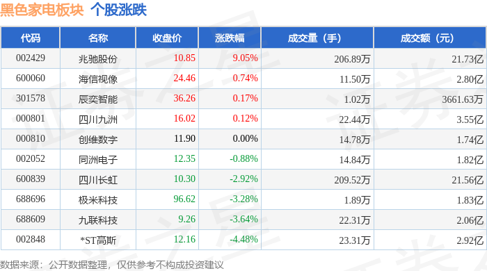 从资金流向上来看,当日黑色家电板块主力资金净流出2.77亿元,游资资金净流入190.54万元,散户资金 净流入2.75亿元。黑色家电板块个股资金流向见下表: | 代码 | 名称 | 主力净流入(元) | 主力净占比 游资净流入 (元) | | 游资净占比 散户净流入 (元) | | 散户净占比 | | --- | --- | --- | --- | --- | --- | --- | --- | | 002429 兆驰股份 | | 8036.88万 | 3.70% | -5257.66万 | -2.42% | -2779.21万 | -1.28% | | 301578 辰奕智能 | | -180.83万 | -4.94% | -88.66万 | -2.42% | 269.49万 | 7.36% | | 000810 创维数字 | | -393.88万 | -2.26% | -545.32万 | -3.13% | 939.20万 | 5.40% | | 688609 九联科技 | | -806.75万 | -3.92% | 2490.09万 | 12.10% | -1683.34万 | -8.18% | | 6 ...
