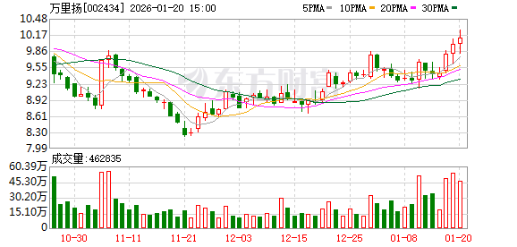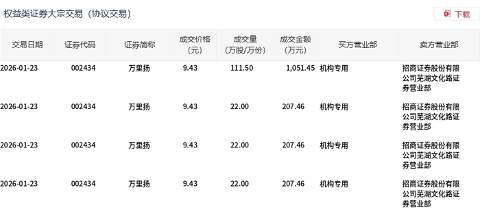 1月23日,万里扬大宗交易成交177.5万股,成交额1673.83万元,占当日总成交额的2.24%,成交价9.43 元,较市场收盘价10.84元折价13.01%。 | 交易日期 | 证券代码 | 证券简称 | 成交价格 | 成交量 | 成交全额 | | 买方营业部 | 卖方营业部 | | --- | --- | --- | --- | --- | --- | --- | --- | --- | | | | | (元) | (万股/万份) | (万元) | | | | | 2026-01-23 | 002434 | 万里扬 | 9.43 | 111.50 | | 1,051.45 机构专用 | | 招商证券股份有限 | | | | | | | | | | 公司芜湖文化路证 | | | | | | | | | | 券营业部 | | 2026-01-23 | 002434 | 万里扬 | 9.43 | 22.00 | 207.46 | 机构专用 | | 招商证券股份有限 | | | | | | | | | | 公司芜湖文化路证 | | | | | | | | | | 券营业部 | | 2026-01-23 | 00 ...