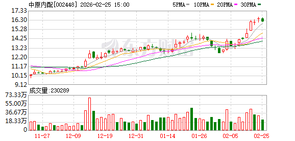 近期资金流向显示,2月11日主力资金净流入2776.91万元,2月12日开盘后继续呈现主力净流入态势。 业绩经营情况 股价情况 公司2025年第三季度业绩表现强劲,单季度归母净利润同比增长64.72%,营收同比增长20.22%,毛利 率提升至27.88%。 经济观察网中原内配(002448)(002448.SZ)股价于2月12日突破60日新高,最高触及15.64元,收盘报 15.52元,单日涨幅4.65%,显著高于其60日移动平均线12.54元。 资金动向 技术面上,该股MACD指标呈现金叉状态,KDJ指标中J线达到109.28,显示短期买盘活跃。 机构观点 最近90天内共有3家机构给出评级,其中2家为买入评级,1家为增持评级,目标均价为15.72元。 以上内容基于公开资料整理,不构成投资建议。 ...