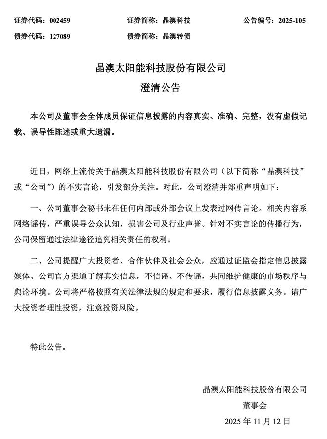 Core Viewpoint - Company clarifies that recent rumors circulating about it are false and have misled the public, damaging its reputation and that of the industry [2][6] Group 1: Company Response - Company states that its board secretary has not made any statements in internal or external meetings regarding the rumors [2] - Company reserves the right to pursue legal action against those spreading false information [2] - Company emphasizes the importance of obtaining accurate information through official channels and urges the public not to spread rumors [6] Group 2: Market Impact - The solar energy sector, including companies like Canadian Solar, Tongwei Co., Longi Green Energy, and JA Solar, experienced significant declines in stock prices due to the rumors [7] - Company expresses confidence in the implementation of policies aimed at reducing competition within the solar industry and supports the establishment of a storage platform [7] - Company acknowledges the need for collaboration among various parties to overcome challenges for the healthy development of the industry [7]