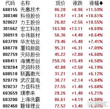 MACD金叉信号形成,这些股涨势不错! | 代码 | 名称 | | 涨幅% ↑ | 总市值 | 年初至今涨幅%。 | | --- | --- | --- | --- | --- | --- | | 000688 | 国城矿业 | - | -8.98 | 306亿 | -7.01 | | 002738 | 中矿资源 | t | -7.24 | 598 Z | 5.49 | | 002240 | 盤新锂能 | 1 | -6.05 | 323 Z | 2.35 | | 002756 | 永兴材料 | 1 | -5.31 | 287亿 | -1.71 | | 001203 | 大中矿业 | | -4.95 | 444亿 | -5.42 | | 002192 | 融捷股份 | | -4.76 | 145亿 | 7.85 | | 002466 | 天齐锂业 | I | -4.39 | 978亿 | 7.66 | | 000762 | 西藏矿业 | 1 | -3.85 | 146亿 | 6.55 | | 300267 | 尔康制药 | ﮨﮯ | -3.82 | 88.28亿 | 25.51 | | 002176 | 江特电 ...