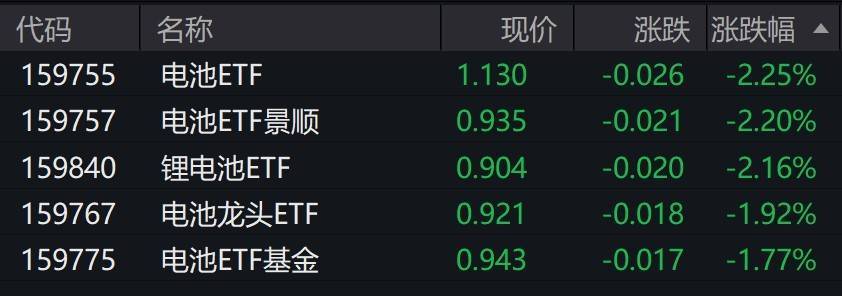 电池概念股早盘走弱,亿纬锂能、赣锋锂业跌超4%,欣旺达跌超3%。 受盘面影响,电池相关ETF跌约2%。 有分析认为,近年来,政策支持为电池行业发展注入了强劲动力。国家持续推出新能源汽车鼓励政策,包括以旧换新、 充电基础设施建设及新能源下乡等,进一步释放了消费潜力。同时,"反内卷"政策的逐步落地促使行业竞争趋于理性, 整体盈利环境有望改善。 每日经济新闻 | 代码 | 名称 | 现价 | | 涨跌 涨跌幅 ▲ | | --- | --- | --- | --- | --- | | 159755 | 电池ETF | 1.130 | -0.026 | -2.25% | | 159757 | 电池ETF景顺 | 0.935 | -0.021 | -2.20% | | 159840 | 锂电池ETF | 0.904 | -0.020 | -2.16% | | 159767 | 电池龙头ETF | 0.921 | -0.018 | -1.92% | | 159775 | 电池ETF基金 | 0.943 | -0.017 | -1.77% | ...