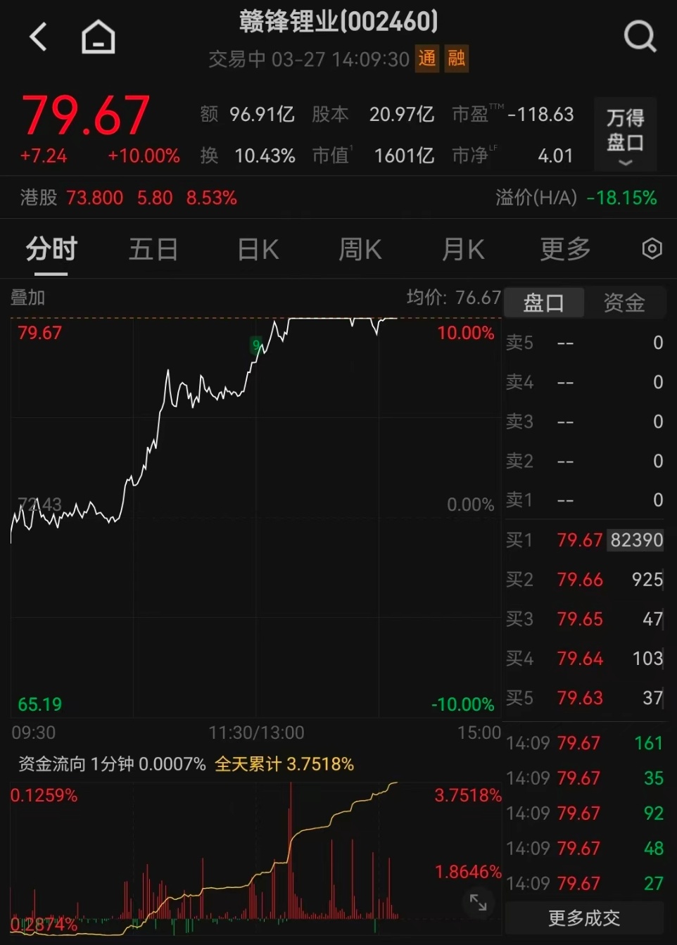 香港联交所最新资料显示,3月20日,小摩增持赣锋锂业(002460)(01772)174.8863万股,每股作价 58.1093港元,总金额约为1.02亿港元。增持后最新持股数目约为2515.12万股,最新持股比例为5.2%。 赣锋锂业 赣锋锂业 分时图 日K线 周K线 月K线 72.43 1.80 2.55% 4.29% 2.86% 1.43% 0.00% 1.43% 2.86% 4.29% 67.60 68.61 69.62 70.63 71.64 72.65 73.66 09:30 10:30 11:30/13:00 14:00 15:00 0 65万 130万 196万 ...