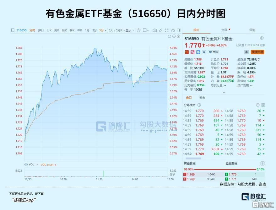 当下,国内市场对于贵金属、有色等资源股的估值认可越来越高。 从稀土,到黄金白银,到锂金属、再到铜铝有色等工业金属,相关资产在大量资金涌入下接连开启持续猛涨模式。 11月13日,在期货及A股市场的黄金白银,还有铜、锂、铝、铅等有色金属相关资产都再次迎来全面大涨行情,带动黄金股ETF(159562)大涨3.07%, 有色金属ETF基金(516650)更是大涨4.06%,均显著跑赢大市。 01、全面大涨 当地时间11月12日,美国结束政府停摆,代表官方经济数据将恢复发布,这将为美联储12月的降息重新带来希望。受此预期提振,国际黄金价格周三延续 反弹走势,并再次突破4200美元/盎司大关。 这一利好消息也点燃了今天A股市场的贵金属市场。 截至今日收市,国内黄金、白银期货主力合约分别大涨1.56%、5.48%,并带动大量其他有色金属资产大涨。 本周4个交易日以来,黄金白银的期货价格已分别累计上涨4.34%、9.61%,其中白银更收报12588元/千克,强势突破前期高点并创下历史新高记录。 这轮关于资源金属的牛市行情,正在走出比市场预期更为强势的节奏。 截至收盘,兴业银锡、国城矿业、永兴材料、合金投资、盛新锂能、盛屯矿业 ...