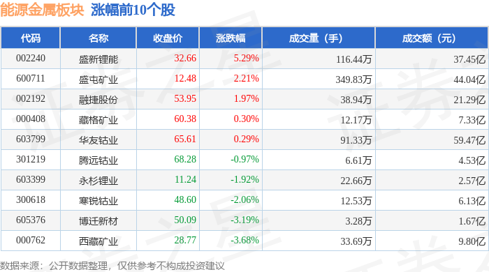 证券之星消息,11月14日能源金属板块较上一交易日下跌1.39%,天齐锂业领跌。当日上证指数报收于 3990.49,下跌0.97%。深证成指报收于13216.03,下跌1.93%。能源金属板块个股涨跌见下表: 从资金流向上来看,当日能源金属板块主力资金净流出12.51亿元,游资资金净流入9.89亿元,散户资金 净流入2.61亿元。能源金属板块个股资金流向见下表: | 代码 | 名称 | 收盘价 | 涨跌幅 | 成交量(手) | 成交额(元) | | | --- | --- | --- | --- | --- | --- | --- | | 002240 | 盛新理能 | 32.66 | 5.29% | 116.44万 | | 37.45 Z | | 600711 | 蓝电矿业 | 12.48 | 2.21% | 349.83万 | | 44.04亿 | | 002192 | 融捷股份 | 53.95 | 1.97% | 38.94万 | | 21.29亿 | | 000408 | 藏格矿业 | 60.38 | 0.30% | 12.17万 | | 7.33亿 | | 603799 | 华友钻业 | 65.61 ...