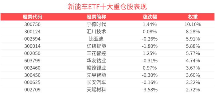 数据显示,截至2025年10月31日,中证新能源汽车产业指数(930997)前十大权重股分别为宁德时代 (300750)、汇川技术(300124)、三花智控(002050)、比亚迪(002594)、亿纬锂能(300014)、华友钴业 (603799)、赣锋锂业(002460)、先导智能(300450)、长安汽车(000625)、天齐锂业(002466),前十大权重 股合计占比53.56%。 | 股票代码 | 股票简称 | 涨跌幅 | 权重 | | --- | --- | --- | --- | | 300750 | 宁德时代 | 1.44% | 10.10% | | 300124 | 汇川技术 | 0.08% | 8.28% | | 002594 | 比亚迪 | -0.26% | 5.91% | | 300014 | 亿纬锂能 | -1.80% | 5.88% | | 002050 | 三花智控 | 1.25% | 5.77% | | 603799 | 华友钻业 | -0.31% | 4.74% | | 002460 | 赣锋锂业 | 0.97% | 3.67% | | 300450 | 先导智能 | -0. ...