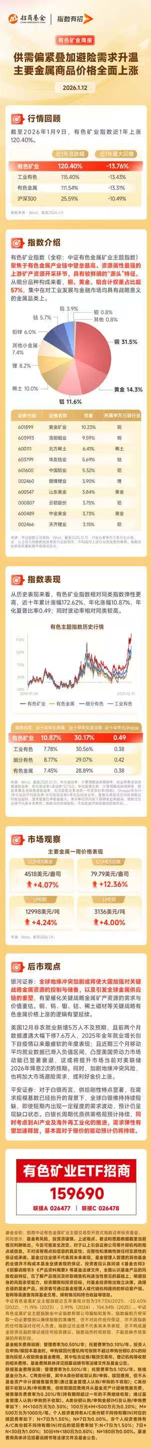 金属商品全面上涨。上周,COMEX金银分别上涨4.07%、12.36%,LME铜、铝、锌、铅、镍、锡分别 上涨4.24%、4.00%、0.85%、2.14%、5.25%、12.75%。 平安证券指出,对于白银而言,供给刚性特点显著,在需求规模基数已经抬升的背景下,全球白银维持 持续短缺,即使短期内出现一定程度的需求波动,预计仍呈现缺口状态。白银长周期优质供需格局预计 持续,同时考虑到AI产业及海外再工业化的推进,需求弹性有望加速释放,基本面对于银价的驱动预 计仍将持续。 银河证券认为,全球地缘冲突加剧或将使大国加强对关键战略金属资源的控制与储备,以及引发全球金 属供应链的重塑,有望催化关键战略金属矿产资源的需求与价值重估。铜、钨、钼、钴、稀土磁材等关 键战略有色金属价格上涨的逻辑有望延续。 有色矿业ETF招商(159690) 跟踪中证有色金属矿业指数,聚焦资源品上游,黄金、铜、铝等关键金 属权重占比近6成,截至1月9日,近一年涨幅达120%,相对主流有色指数弹性更佳。 | 利士 10.0% | | | 黄金 14.3% | | --- | --- | --- | --- | | | 铝 11.6% | | | ...