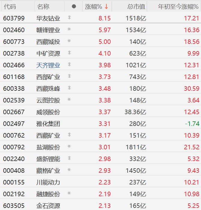 责任编辑:栎树 | 代码 | 名称 | | 涨幅% ↓ | 总市值 | 年初至今涨幅%。 | | --- | --- | --- | --- | --- | --- | | 603799 | 华友钻业 | 1 | 8.15 | 1518亿 | 17.21 | | 002460 | 赣锋锂业 | -06- | 5.97 | 1534 Z | 16.36 | | 600773 | 西藏城投 | -06- | 5.00 | 140亿 | 18.56 | | 002738 | 中矿资源 | 1 | 4.10 | 623 6 | 9.99 | | 002466 | 天齐锂业 | 1 | 3.98 | 1021亿 | 12.31 | | 601168 | 西部矿业 | 1 | 3.73 | 743亿 | 12.81 | | 600338 | 西藏珠峰 | 1 | 3.48 | 180亿 | 30.59 | | 002539 | 云图控股 | 豪 | 3.38 | 148亿 | 3.64 | | 002667 | 威领股份 | | 3.37 | 38.36亿 | 12.45 | | 002497 | 雅化集团 | | 3. ...