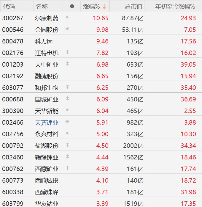 津巴布韦暂停锂矿出口 天齐锂业高开逾6% 赣锋锂业高开逾5%