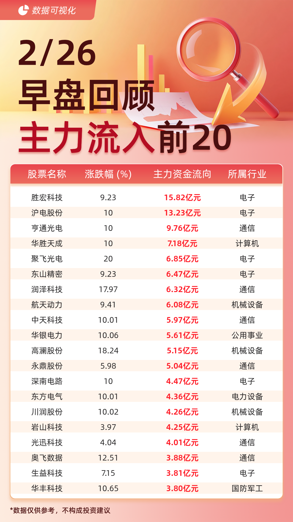据交易所数据显示,截至2月26日午间收盘,主力资金流入前20的股票分别为: 胜宏科技(15.82亿元)、 沪电股份(13.23亿元)、 亨通光电(9.76亿 元)、 华胜天成(7.18亿元)、 聚飞光电(6.85亿元)、 东山精密(6.47亿元)、 润泽科技(6.32亿元)、 航天动力(6.08亿元)、 中天科技(5.97亿 元)、 华银电力(5.61亿元)、 高澜股份(5.15亿元)、 永鼎股份(5.04亿元)、 深南电路(4.47亿元)、 东方电气(4.36亿元)、 川润股份(4.26亿 元)、 岩山科技(4.25亿元)、 光迅科技(4.01亿元)、 奥飞数据(3.88亿元)、 生益科技(3.81亿元)、 华丰科技(3.80亿元)。 *数据仅供参考,不构成投资建议 | 股票名称 | 涨跌幅 (%) | 主力资金流向 | 所属行) | | --- | --- | --- | --- | | 胜宏科技 | 9.23 | 15.82亿元 | 电子 | | 沪电股份 | 10 | 13.23亿元 | 电子 | | 亨通光电 | 10 | 9.76亿元 | 通信 | | 华胜天成 | 10 | 7.18亿元 | 计 ...