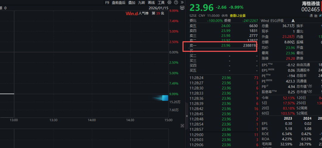 A股市场今天上午出现调整,主要指数不同程度下跌。 值得注意的是,包括海格通信、岩山科技、金风科技在内的多只近期热门股卖一位置出现市值超过10亿元的巨额卖单。 此外,上午有色金属等板块领涨,一度程度上稳定市场人气。 A股有色金属板块领涨 A股市场今天(1月15日)上午整体走低,但跌势相对温和,上证指数盘中一度跌破4100点整数关口。截至中午收盘,上证指数跌0.6%,深证成指跌 0.44%,创业板指跌1.02%,科创综指跌2.02%。 主要行业板块和赛道方面,若按照申万一级行业划分,有色金属板块领涨,板块盘中涨幅超过3%。锌业股份、四川黄金、罗平锌电等多股盘中涨停,另 有多股跟涨。 消息面上,多个金属品种期货价格继续上涨,今天上午盘中沪锡期货主力合约涨幅超过9%,沪镍期货主力合约涨幅超过7%。 基础化工、石油石化、交通运输等板块涨幅居前,国防军工、传媒、综合、计算机等板块上午盘中领跌。 概念板块方面,商业航天概念再度调整,万得商业航天概念指数盘中跌幅超过5%,该指数多只成份股上午盘中跌幅超过10%。 多只翻倍股卖一位置现10亿元以上卖单 值得注意的是,今天上午多只近期热门股跌停,这里面多只股票卖一位置出现巨量卖单 ...