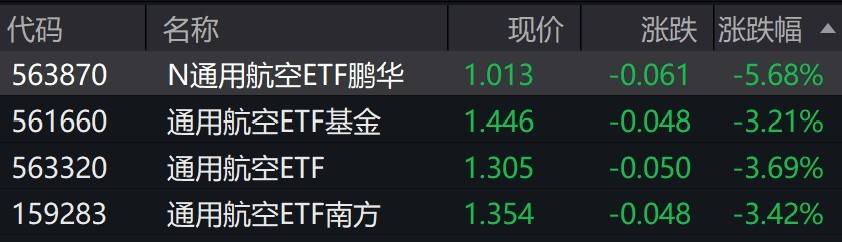 有券商表示,低空经济是写入政府工作报告的战略新兴产业,是我国交通网规划中的重要组成部分,各级政府均出台大 量支持性政策,为低空经济保驾护航。目前,其市场空间正加速打开,到2035年我国无人机低空市场空间有望超3.1万 亿元,有人eVTOL也将有超5000亿空间。 受盘面影响,通用航空相关ETF跌超3%。 | 代码 | 名称 | 现价 | | 涨跌 涨跌幅 ▲ | | --- | --- | --- | --- | --- | | 563870 | N通用航空ETF鹏华 | 1.013 | -0.061 | -5.68% | | 561660 | 通用航空ETF基金 | 1.446 | -0.048 | -3.21% | | 563320 | 通用航空ETF | 1.305 | -0.050 | -3.69% | | 159283 | 通用航空ETF南方 | 1.354 | -0.048 | -3.42% | 通用航空概念股走弱,中科星图跌超11%,航天电子、海格通信跌停,中国卫通跌超5%。 每日经济新闻 ...
