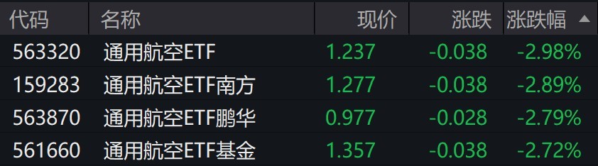 有券商表示,低空经济是写入政府工作报告的战略新兴产业,是我国交通网规划中的重要组成部分,各级政府均出台大 量支持性政策,为低空经济保驾护航。目前,其市场空间正加速打开,到2035年我国无人机低空市场空间有望超3.1万 亿元,有人eVTOL也将有超5000亿空间。 | 代码 名称 | 涨跌 涨跌幅 ▲ 现价 | | --- | --- | | 563320 通用航空ETF | 1.237 - - 0.038 -2.98% | | 159283 通用航空ETF南方 | 1.277 - - 0.038 -2.89% | | 563870 通用航空ETF鹏华 | 0.977 - -0.028 -2.79% | | 561660 通用航空ETF基金 | 1.357 - - 0.038 -2.72% | 通用航空概念股走低,航天电子跌超6%,海格通信、中国卫通、中科星图跌超3%。 受盘面影响,通用航空相关ETF跌近3%。 (文章来源:每日经济新闻) ...