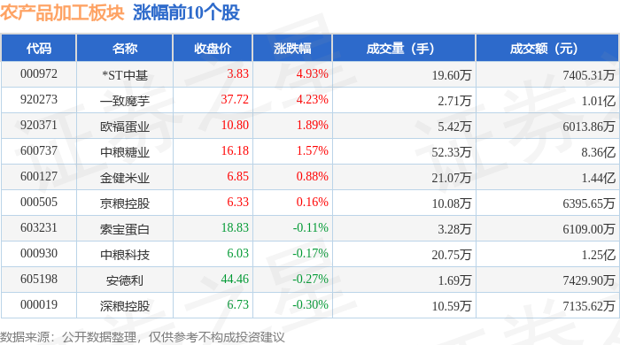 从资金流向上来看,当日农产品加工板块主力资金净流出1178.04万元,游资资金净流入3503.85万元,散 户资金净流出2325.81万元。农产品加工板块个股资金流向见下表: 证券之星消息,10月13日农产品加工板块较上一交易日下跌0.19%,ST朗源领跌。当日上证指数报收于 3889.5,下跌0.19%。深证成指报收于13231.47,下跌0.93%。农产品加工板块个股涨跌见下表: | 代码 | 名称 | 收盘价 | 涨跌幅 | 成交量(手) | 成交额(元) | | --- | --- | --- | --- | --- | --- | | 000972 | *ST中基 | 3.83 | 4.93% | 19.60万 | 7405.31万 | | 920273 | 一致魔宇 | 37.72 | 4.23% | 2.71万 | 1.01亿 | | 920371 | 欧福省业 | 10.80 | 1.89% | 5.42万 | 6013.86万 | | 600737 | 中粮糖业 | 16.18 | 1.57% | 52.33万 | 8.36亿 | | 600127 | 金健米业 | 6.85 | 0.88% ...
