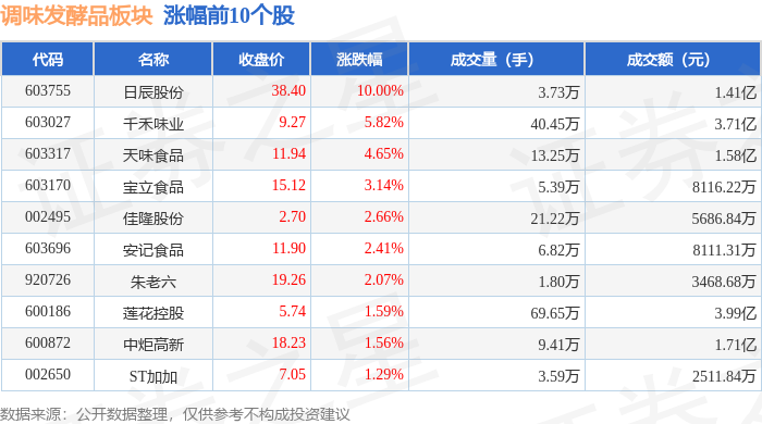 从资金流向上来看,当日调味发酵品板块主力资金净流出6096.35万元,游资资金净流入1291.29万元,散 户资金净流入4805.06万元。调味发酵品板块个股资金流向见下表: | 代码 | 名称 | 收盘价 | 涨跌幅 | 成交量(手) | 成交额(元) | | | --- | --- | --- | --- | --- | --- | --- | | 920726 | 朱老六 | 19.28 | 3.54% | 1.83万 | | 3445.32万 | | 603755 | 日辰股份 | 34.71 | 2.30% | 1.93万 | | 6570.30万 | | 600298 | 安頂酵母 | 41.00 | 2.27% | 7.50万 | | 3.06亿 | | 300908 | 仲景食品 | 29.83 | 1.46% | 1.81万 | | 5329.88万 | | 002650 | ST加加 | 7.08 | 1.14% | 14.38万 | | 1.04亿 | | 603317 | 天味食品 | 11.40 | 1.06% | 4.92万 | | 5570.79万 | | 600186 | 连化 ...