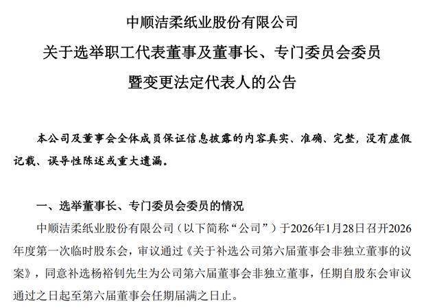 瑞财经 刘治颖 1月28日,中顺洁柔(SZ002511)公告,公司于2026年1月28日召开2026年度第一次临时股 东会,同意补选杨裕钊为公司第六届董事会非独立董事。 同日,公司召开第六届董事会第十六次会议,同意选举杨裕钊为第六届董事会董事长,为代表公司执行 公司事务的董事,同时担任董事会战略与可持续发展委员会委员、提名委员会委员职务。 杨裕钊,男,1962年出生,中国国籍。追随公司创始人邓颖忠多年,历任公司销售部经理、唐山分公司 总经理、湖北中顺总经理、中顺洁柔董事长助理,2015年-2017年任公司董事,2009年起至今担任公司 董事长助理,2026年1月起任公司董事长。 据瑞财社查阅,中顺洁柔上一任董事长为刘鹏。1月9日,刘鹏辞去了公司董事、董事长等职务,仍在公 司担任其他职务。而在去年12月中,他已经辞任了总裁,由公司董事高波接任。 刘鹏,男,1980年出生,本科学历,中国国籍。先后在兴业银行江门分行,兴业银行中山分行担任行长 职务。中国造纸协会生活用纸专业委员会副主任委员。2021年3月起担任公司总裁,2021年4月起担任公 司董事长。 2021年-2024年,刘鹏年薪608.17万元、607.5 ...