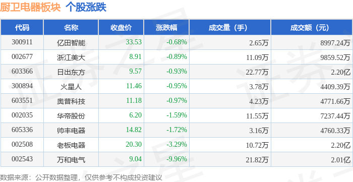 从资金流向上来看,当日厨卫电器板块主力资金净流入214.06万元,游资资金净流入964.74万元,散户资 金净流出1178.8万元。厨卫电器板块个股资金流向见下表: 证券之星消息,2月2日厨卫电器板块较上一交易日下跌2.77%,万和电气领跌。当日上证指数报收于 4015.75,下跌2.48%。深证成指报收于13824.35,下跌2.69%。厨卫电器板块个股涨跌见下表: | 代码 | 名称 | 收盘价 | 涨跌幅 | 成交量(手) | 成交额(元) | | --- | --- | --- | --- | --- | --- | | 300911 | 亿田智能 | 33.53 | -0.68% | 2.65万 | 8997.24万 | | 002677 | 浙江美大 | 8.91 | -0.89% | 11.09万 | 9859.52万 | | 603366 | 日出东方 | 9.57 | -0.93% | 22.77万 | 2.20亿 | | 300894 | 火星人 | 11.46 | -0.95% | - 3.78万 | 4409.39万 | | 603551 | 奥普科技 | 11.18 | -0.97% ...