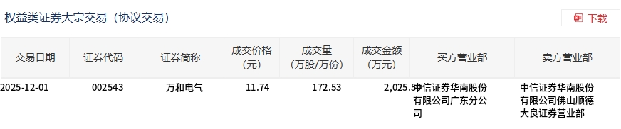 12月1日,万和电气大宗交易成交172.53万股,成交额2025.5万元,占当日总成交额的31.39%,成交价11.74元,较市场收盘 价10.81元溢价8.6%。 | 交易日期 | 证券代码 | 证券简称 | 成交价格 | 成交星 | 成交金额 买方营业部 (万元) | 卖方营业部 | | --- | --- | --- | --- | --- | --- | --- | | | | | (元) | (万股/万份) | | | | 2025-12-01 | 002543 | 万和电气 | 11.74 | 172.53 | 2,025.5 信证券华南股份 | 中信证券华南股份 | | | | | | | 有限公司广东分公 | 有限公司佛山顺德 | | | | | | | 크 | 大良证券营业部 | ...