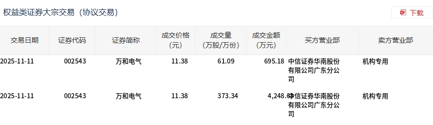 Group 1 - The core transaction of Wanhua Electric involved a block trade of 4.3443 million shares, with a total transaction value of 49.4381 million yuan, accounting for 57.41% of the total trading volume on that day [1] - The transaction price was 11.38 yuan, which remained stable compared to the market closing price of 11.38 yuan [1] - The trading date was November 11, 2025, and the securities code for Wanhua Electric is 002543 [2] Group 2 - The block trade included a volume of 61.09 million shares at a price of 11.38 yuan, resulting in a total value of 695.18 thousand yuan [2] - Another part of the block trade involved 373.34 million shares, with a total value of 4,248.6 thousand yuan, also at the price of 11.38 yuan [2]