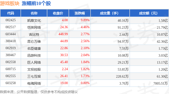 证券之星消息,1月6日游戏板块较上一交易日上涨1.05%,凯撒文化领涨。当日上证指数报收于 4083.67,上涨1.5%。深证成指报收于14022.55,上涨1.4%。游戏板块个股涨跌见下表: | 代码 | 名称 | 收盘价 | 涨跌幅 | 成交量(手) | 成交额(元) | | --- | --- | --- | --- | --- | --- | | 002425 | 凯撒文化 | 4.00 | 9.89% | 40.16万 | 1.58亿 | | 002517 | 恺英网络 | 24.36 | 4.46% | 91.23万 | 21.79亿 | | 603444 | 吉比特 | 448.99 | 2.77% | 2.44万 | 10.87亿 | | 300418 | 昆仑万维 | 44.89 | 2.56% | 94.97万 | 42.36亿 | | 002919 | 名臣健康 | 22.86 | 2.10% | 7.59万 | 1.73亿 | | 300467 | 迅游科技 | 30.53 | 2.04% | 10.08万 | 3.03亿 | | 002558 | 巨人网络 | 45.40 | 1.8 ...
