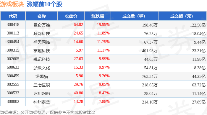 | 代码 | 名称 | | 涨幅% ↓ | 总市值 | 年初至今涨幅%。 | | --- | --- | --- | --- | --- | --- | | 301330 | 熵基科技 | 1 | 19.40 | 117亿 | 50.11 | | 300409 | 道氏技术 | 1 | 13.91 | 259亿 | 47.49 | | 300143 | 盈康生命 | -06- | 13.01 | 100亿 | 35.43 | | 300459 | 汤姆猫 | 1 | 10.19 | 209亿 | 29.63 | | 002195 | 岩山科技 | 1 | 10.05 | 646亿 | 60.65 | | 300753 | 爰朋医疗 | 1 | 9.99 | 53.97亿 | 54.31 | | 002555 | 三七互娱 | 4 | 9.97 | 664亿 | 27.16 | | 300433 | 蓝思科技 | 1 | 9.80 | 2245亿 | 40.34 | | 600775 | 南京熊猫 | 1 | 9.33 | 182亿 | 63.01 | | 688158 | 优刻得-W * | | 8.97 | ...