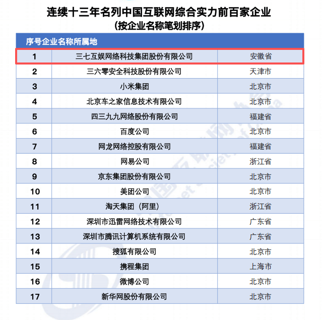 Core Viewpoint - The 2025 China Internet Enterprise Comprehensive Strength Index was released, highlighting the top companies in the industry, with Sanqi Interactive Entertainment ranking 17th, marking a significant achievement for the company and the province of Anhui [1][4]. Group 1: Company Rankings - Sanqi Interactive Entertainment has been included in the China Internet Top 100 for 13 consecutive years, ranking 17th in 2025, the highest among A-share companies and the only representative from Anhui province [1][5]. - The top five companies in the 2025 China Internet Comprehensive Strength Index include Shanghai Xunmeng Information Technology Co., Ltd., Beijing Douyin Information Service Co., Ltd., Ant Group, Taotian Co., Ltd., and Tencent [4]. Group 2: Company Performance - Sanqi Interactive Entertainment's rise in ranking is attributed to its strong performance in enterprise scale, credit, AI innovation, overseas market expansion, and social responsibility [4][6]. - The company aims to continue leveraging Anhui's favorable business environment and policy support to enhance its operations and contribute to the digital economy's high-quality development in the province [6].