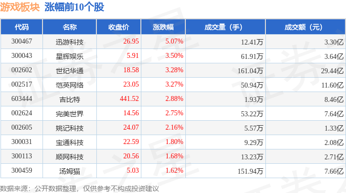 | 代码 | 名称 | 收盘价 | 涨跌幅 | 成交重(手) | 成交额(元) | | --- | --- | --- | --- | --- | --- | | 002624 | 完美世界 | 14.17 | -6.59% | 78.50万 | 11.25亿 | | 002555 | 三七互娱 | 20.58 | -1.77% | 46.34万 | 9.57亿 | | 300467 | 迅游科技 | 25.65 | -1.23% | 4.98万 | 1.28亿 | | 300418 | 昆仑万维 | 43.50 | -0.80% | 48.59万 | 21.22亿 | | 002605 | 姚记科技 | 23.56 | -0.59% | 4.25万 | 9983.47万 | | 002602 | 世纪委演 | 66'ZI | -0.55% | 129.59万 | 23.20亿 | | 300002 | 神州泰岳 | 11.38 | -0.44% | 33.85万 | 3.85 Z | | 300031 | 章通科技 | 22.19 | -0.31% | 5.11万 | 1.13亿 | | 600633 | ...