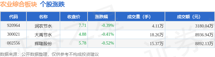 证券之星消息,10月27日农业综合板块较上一交易日上涨0.19%,润农节水领涨。当日上证指数报收于 3996.94,上涨1.18%。深证成指报收于13489.4,上涨1.51%。农业综合板块个股涨跌见下表: 以上内容为证券之星据公开信息整理,由AI算法生成(网信算备310104345710301240019号),不构成投资建议。 从资金流向上来看,当日农业综合板块主力资金净流出780.61万元,游资资金净流出556.13万元,散户资 金净流入1336.73万元。农业综合板块个股资金流向见下表: | | | | 代码 名称 主力净流入(元) 主力净占比 游资净流入(元) 游资净占比 散户净占比 | | | | | --- | --- | --- | --- | --- | --- | --- | | 002556 辉隆股份 | -353.25万 | -5.07% | -360.49万 | -5.18% | 713.74万 | 10.25% | | 300021 大禹节水 | -427.36万 | -4.16% | -195.63万 | -1.90% | 622.99万 | 6.06% | | 代码 | 名称 | ...