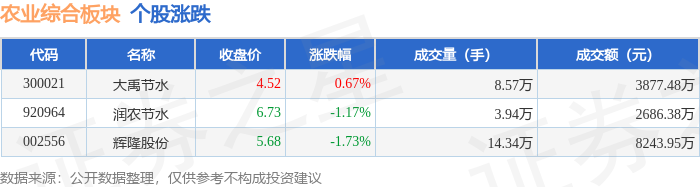 从资金流向上来看,当日农业综合板块主力资金净流出771.98万元,游资资金净流入229.81万元,散户资 金净流入542.17万元。农业综合板块个股资金流向见下表: 证券之星消息,12月12日农业综合板块较上一交易日下跌0.73%,辉隆股份领跌。当日上证指数报收于 3889.35,上涨0.41%。深证成指报收于13258.33,上涨0.84%。农业综合板块个股涨跌见下表: | 代码 | 名称 | 收盘价 | 涨跌幅 | 成交量(手) | 成交额(元) | | | --- | --- | --- | --- | --- | --- | --- | | 300021 | 大禹节水 | 4.52 | 0.67% | 8.57万 | | 3877.48万 | | 920964 | 润农节水 | 6.73 | -1.17% | 3.94万 | | 2686.38万 | | 002556 | 辉隆股份 | 5.68 | -1.73% | 14.34万 | | 8243.95万 | | 代码 | | | 名称 │主力净流入(元)│主力净占比│游资净流入(元)│游资净占比│散户净流入(元)│散户净占比 | | | | | - ...