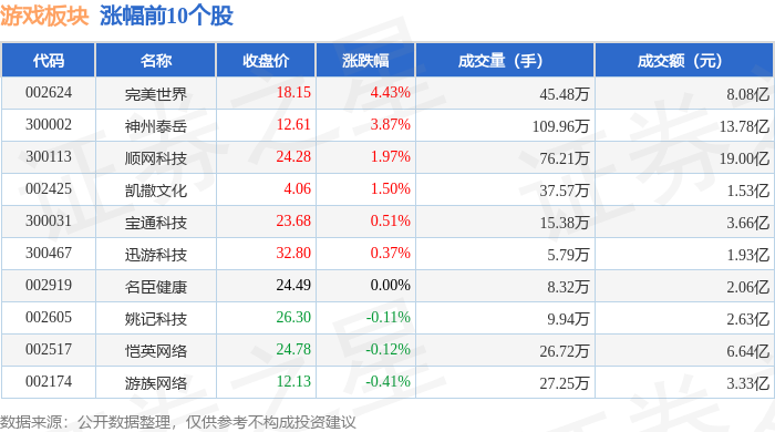 证券之星消息,1月28日游戏板块较上一交易日下跌1.28%,巨人网络领跌。当日上证指数报收于4151.24,上涨0.27%。深证成指报收于14342.9, 上涨0.09%。游戏板块个股涨跌见下表: 从资金流向上来看,当日游戏板块主力资金净流出2.44亿元,游资资金净流入4074.63万元,散户资金净流入2.03亿元。游戏板块个股资金流向见 下表: | 代码 | 名称 | 主力净流入(元) | 主力净占比 游资净流入(元) | | 游资净占比 散户净流入 (元) | | 散户净占比 | | --- | --- | --- | --- | --- | --- | --- | --- | | 300418 | 昆仑万维 | 4 2.73 Z | 4.97% | 4547.85万 | 0.83% | -3.19 Z | -5.80% | | 300002 神州泰岳 | | 1.72亿 | 12.46% | -3185.68万 | -2.31% | -1.40 Z | -10.15% | | 002624 | 完美世界 | 8113.91万 | 10.04% | 1262.45万 | 1.56% | -9376.36万 ...