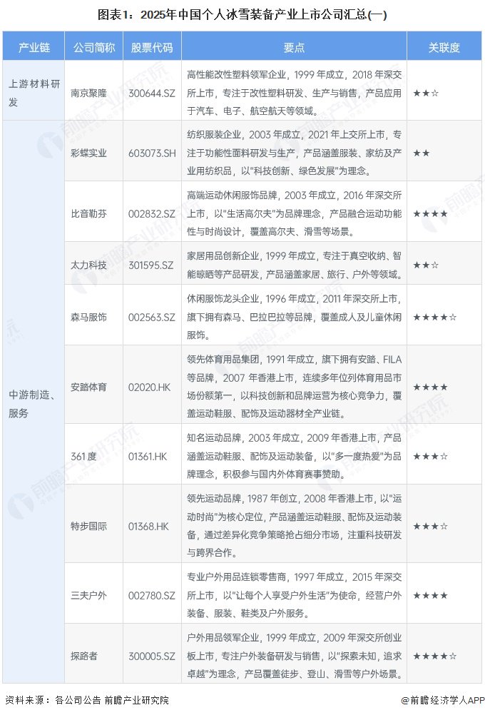 转自:前瞻产业研究院 行业主要上市公司:三夫户外(002780.SZ);探路者(300005.SZ);安踏(02020.HK);英派斯(002899.SZ);舒华 体育(605299.SH);信隆健康(002105.SZ);华立科技(301011.SZ)等 本文核心数据:上市公司业务布局;上市公司业绩对比 个人冰雪装备行业上市公司汇总 中国冰雪装备产业上市公司数量较少,业务聚焦两大方向。一类围绕户外运动,如安踏探路者等研发销 售滑雪服雪具等装备,三夫户外布局装备零售与滑雪服务;另一类专注冰雪设施建设,英派斯打造仿真 冰场滑雪模拟机,冰山冷热雪人股份提供场馆制冰系统与设备,多依托政策与需求推进国产化发展。 图表 1: 2025年中国个人冰雪装备产业上市公司汇总(一) | 产业链 | 公司简称 | 股票代码 | 要点 | 关联度 | | --- | --- | --- | --- | --- | | 上游材料研 | | | 高性能改性塑料领军企业,1999年成立,2018年深交 | | | 发 | 南京聚隆 | 300644.SZ | 所上市,专注于改性塑料研发、生产与销售,产品应用 | ★★☆ | | | | ...
