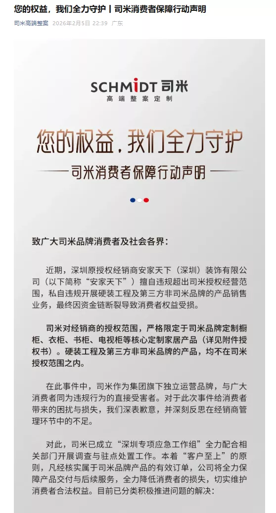 司米出具的授权书和产品销售合同显示,安家天下公司获得的授权期限是2025年全年,授权范围也仅限 定于司米品牌定制橱柜、衣柜、书柜、电视柜等核心定制家居产品。硬装工程及第三方非司米品牌的产 品,均不在司米授权范围之内。 本报讯 2月5日,司米厨柜有限公司官方微信号发布了一封名为《您的权益,我们全力守护丨司米消费 者保障行动声明》的声明,称针对近期一家深圳经销商资金链断裂事件已经成立"深圳专项应急工作 组",全力保障产品交付与后续服务。 此前,多位业主在社交平台反映,家居品牌司米的原授权深圳经销商安家天下(深圳)装饰有限公 司"跑路",事件波及数百户业主,涉案总金额估计达千万元。 司米源于法国的高端定制家居品牌Schmidt Groupe集团,在2014年,司米品牌由上市公司索菲亚家居股 份有限公司引入中国市场并投资建立生产基地,现为索菲亚家居集团旗下全资子公司,是专注于高端整 家定制服务的独立运营品牌。 上述声明指出,安家天下公司擅自违规超出司米授权经营范围,私自违规开展硬装工程及第三方非司米 品牌的产品销售业务,最终因资金链断裂导致消费者权益受损。 此次事件暴露了定制家居行业在终端监管上的共性难题,给包括司米 ...