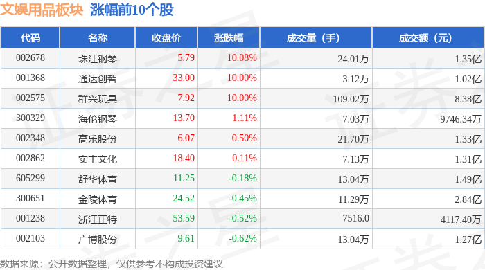 证券之星消息,2月4日文娱用品板块较上一交易日下跌0.82%,群兴玩具领跌。当日上证指数报收于 4102.2,上涨0.85%。深证成指报收于14156.27,上涨0.21%。文娱用品板块个股涨跌见下表: | 代码 | 名称 | 收盘价 | 涨跌幅 | 成交量(手) | 成交额(元) | | --- | --- | --- | --- | --- | --- | | 002575 | 群兴玩具 | 7.33 | -9.62% | 131.71万 | 10.00亿 | | 002301 | 齐心集团 | 7.57 | -2.82% | 21.87万 | 1.66亿 | | 002899 | 英派斯 | 31.72 | -2.79% | 4.25万 | 1.35亿 | | 001238 | 浙江正特 | 53.88 | -1.17% | 4433.05 | 2413.96万 | | 002103 | 广博股份 | 9.60 | -1.03% | 12.55万 | 1.20亿 | | 301011 | 华立科技 | 25.96 | -0.99% | 2.11万 | 5475.52万 | | 301101 | 明月镜片 ...
