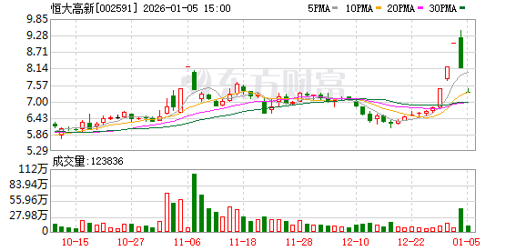 恒大高新所属申万行业为:基础化工-化学制品-其他化学制品。所属概念板块包括:拼多多概念、微盘 股、小盘、垃圾分类、智慧城市等。 截至9月30日,恒大高新股东户数2.09万,较上期减少13.86%;人均流通股10690股,较上期增加 16.09%。2025年1月-9月,恒大高新实现营业收入2.26亿元,同比减少23.53%;归母净利润-230.28万 元,同比减少116.20%。 分红方面,恒大高新A股上市后累计派现1.26亿元。近三年,累计派现0.00元。 机构持仓方面,截止2025年9月30日,恒大高新十大流通股东中,诺安多策略混合A(320016)位居第 六大流通股东,持股266.06万股,相比上期增加91.46万股。金元顺安元启灵活配置混合(004685)位居 第七大流通股东,持股220.28万股,相比上期增加15.28万股。 1月9日,恒大高新盘中上涨2.03%,截至13:59,报7.05元/股,成交1.76亿元,换手率11.29%,总市值 21.16亿元。 资金流向方面,主力资金净流出317.90万元,特大单买入963.81万元,占比5.47%,卖出759.22万元,占 比4.31%;大单买入254 ...