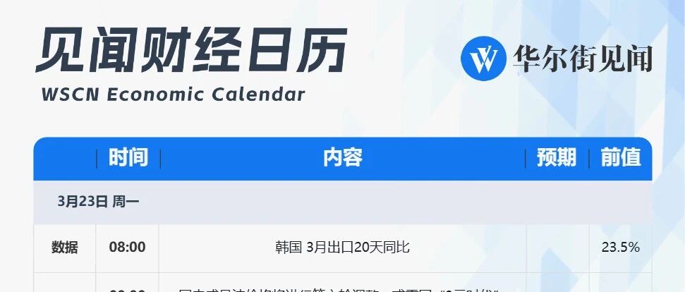 以下文章来源于见闻历 ,作者龙玥 见闻历 . 每天多看我一眼,投资赚的多一点。 | 见闻财经日历 WSCN Economic Calendar | | ▼ 华尔街见闻 | | | --- | --- | --- | --- | | 时间 | 内容 | 预期 前值 | | | 3月23日 周一 | | | | | 数据 08:00 | 韩国 3月出口20天同比 | 23.5% | | | 00:00 | 国内成品油价格将进行第六轮调整,或重回"9元时代" | | | | 待定 | 华尔街紧盯中东战事:特朗普威胁称限伊朗48小时开放霍 尔木兹海峡 | | | | 事件 待定 | 美国休斯顿大型CERAWeek能源会议 | | | | 待定 | 中国发展高层论坛2026年年会 | | | | 待定 | 华为举行春季全场景新品发布会 | | | | 财报 | 华润啤酒、药明康德、文远知行、老铺黄金 | | | | 3月24日 周二 | | | | | 07:30 | 日本 2月CPI同比 | 1.4% 1.5% | | | 17:00 数据 | 欧元区 3月制造业PMI初值 | 49.8 50.8 | | | 21: ...