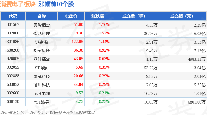 证券之星消息,1月13日消费电子板块较上一交易日下跌3.51%,硕贝德领跌。当日上证指数报收于 4138.76,下跌0.64%。深证成指报收于14169.4,下跌1.37%。消费电子板块个股涨跌见下表: | 代码 | 名称 | 收盘价 | 涨跌幅 | 成交量(手) | 成交额(元) | | --- | --- | --- | --- | --- | --- | | 301567 | 贝隆精密 | 51.00 | 1.76% | 4.53万 | 2.29亿 | | 002866 | 传艺科技 | 19.36 | 1.52% | 30.76万 | 6.03亿 | | 301086 | 灣區灣 | 122.05 | 1.44% | 2.91万 | 3.53亿 | | 688260 | 昀冢科技 | 36.38 | 0.92% | 19.49万 | 7.12亿 | | 920005 | 鼎佳精密 | 43.05 | 0.63% | 1.15万 | 4983.33万 | | 002055 | ST得润 | 5.69 | 0.35% | 53.22万 | 3.04亿 | | 002888 | 惠威科技 | 20.66 | ...