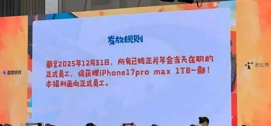 一年一度的年会季,多家游戏大厂凭借"豪横"奖品出圈。 近日,"游戏茅"吉比特(603444 SH)及其子公司雷霆游戏的年会现场照片在社交平台上广泛传播。照片显示,公司所有已转正且年会当天在职的正式员 工,都将获赠一台iPhone 17 Pro Max手机。有消息称,在本次年会上,吉比特旗下游戏《杖剑传说》的主策划林笋获得了一套价值千万的房产,此事还一 度登上热搜。 世纪华通(002602.SZ)子公司点点互动同样在年会上大方"撒钱"。消息显示,点点互动此次年会的所有奖品都将以现金形式发放,最高档奖金为18888元 红包,中奖率为1%,此外,还有15000元、9999元等多档位红包发放。综合中奖率约为58%。 世纪华通、吉比特年会豪放"撒钱"背后,两家公司在2025年均实现业绩大增。 吉比特在业绩预告中表示,公司2025年预计实现归母净利润16.9亿元18.6亿元,同比增长约79%至97%。世纪华通也表示,2025年,公司营收、利润、现 金流等指标均实现大幅增长。自2023年以来,公司的收入连续12个季度环比增长,归母净利润连续两年同比翻倍以上。 游戏公司的业绩增长往往依赖爆款产品,一款高热度游戏往往能够支撑起 ...