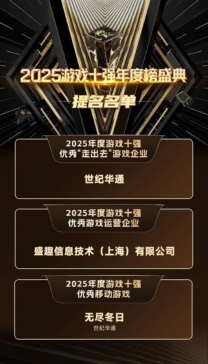 世纪华通获2025游戏十强年度榜三项大奖提名