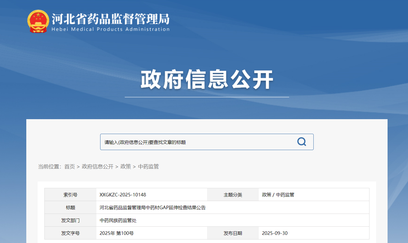 河北省药品监督管理局中药材GAP延伸检查结果公告