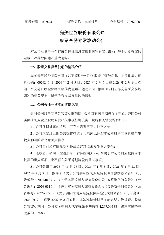经济观察网完美世界(002624)公告称,公司实际控制人池宇峰于2026年1月5日至2月6日期间,通过集 中竞价及大宗交易方式累计减持公司股份3297.93万股,占公司总股本的1.70%。本次减持价格区间为 16.62元/股-19.57元/股,减持均价为17.68/股,本次减持计划已实施完毕。 ...